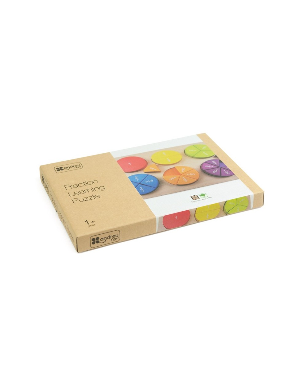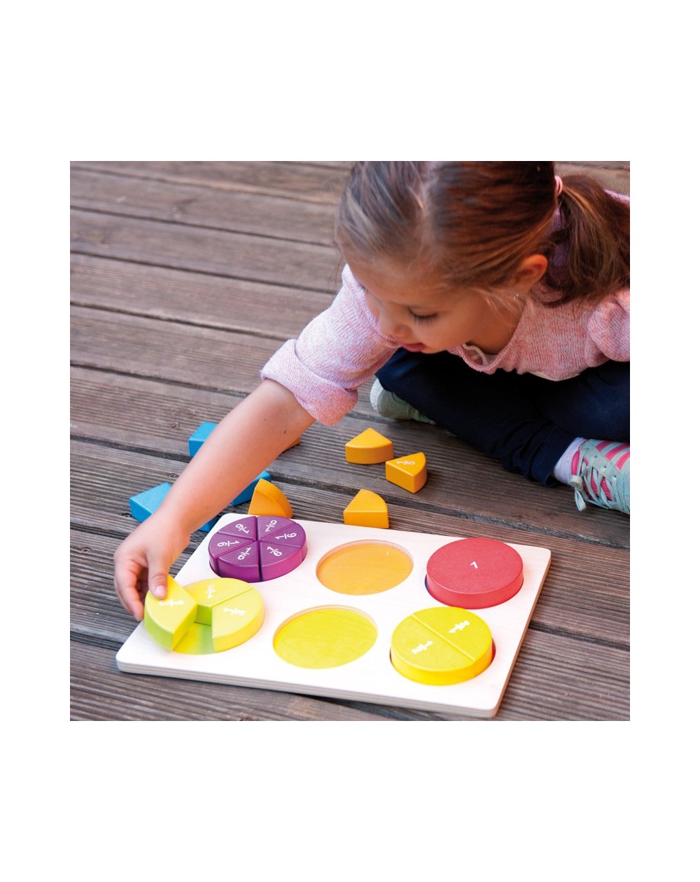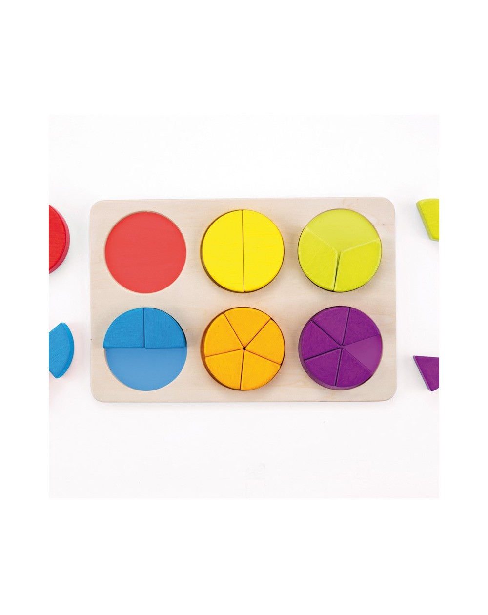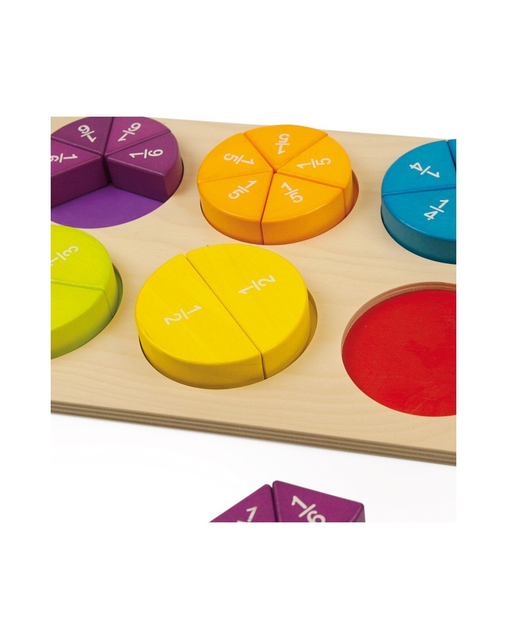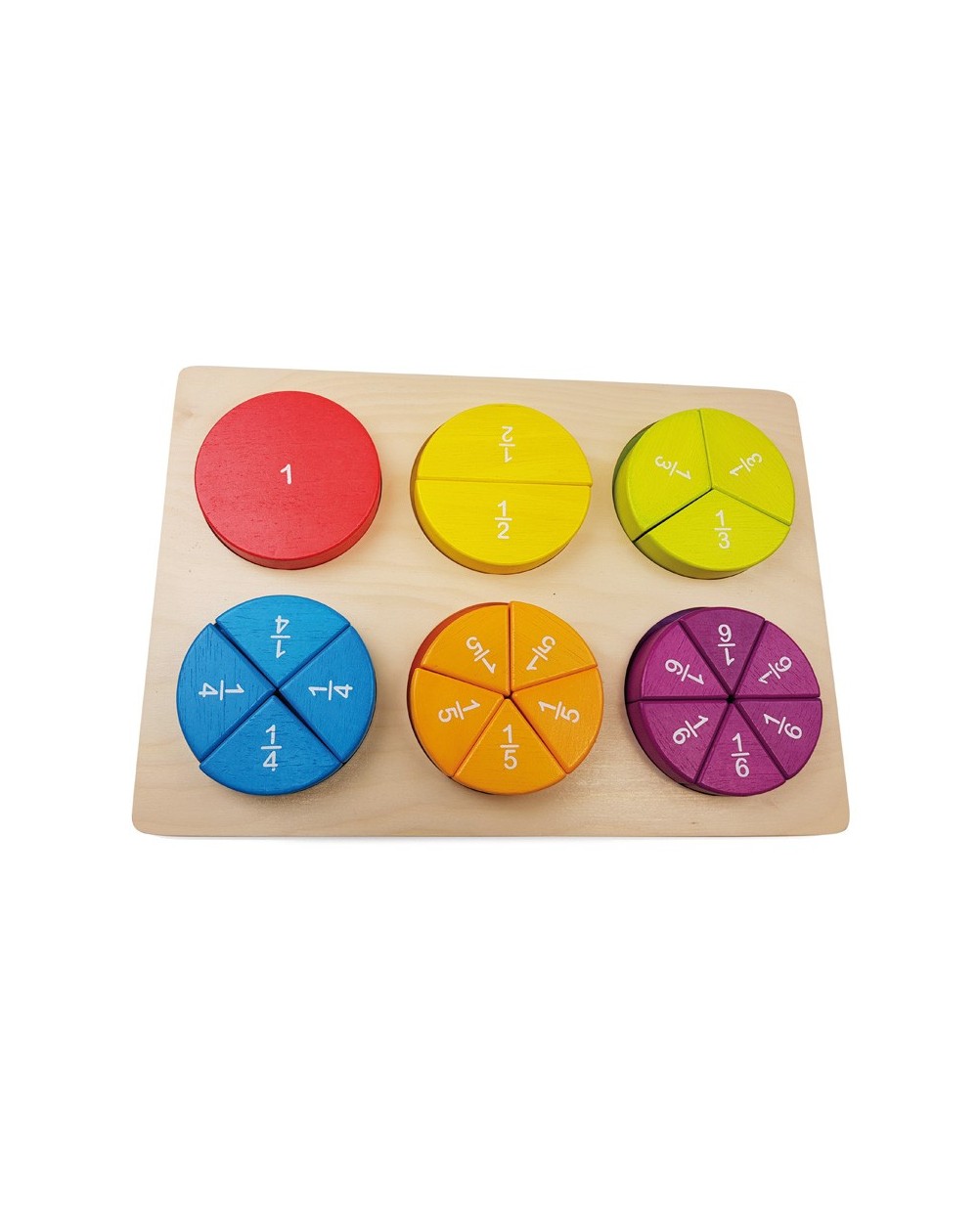 Cada círculo puede asociarse según el color y la cantidad de fracciones correspondientes. El tablero incluye de 1 a 6 fracciones.