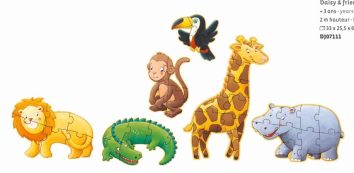 «Ouistiti et ses amis» es un estuche que incluye 6 puzles gigantes evolutivos de siluetas de 4, 6 y 9 piezas. El niño reconstruye los distintos animales de la selva: loro, mono, león, cocodrilo, jirafa e hipopótamo. Después de montarlos, los superpone para crear una gran pirámide de 1,30 m.