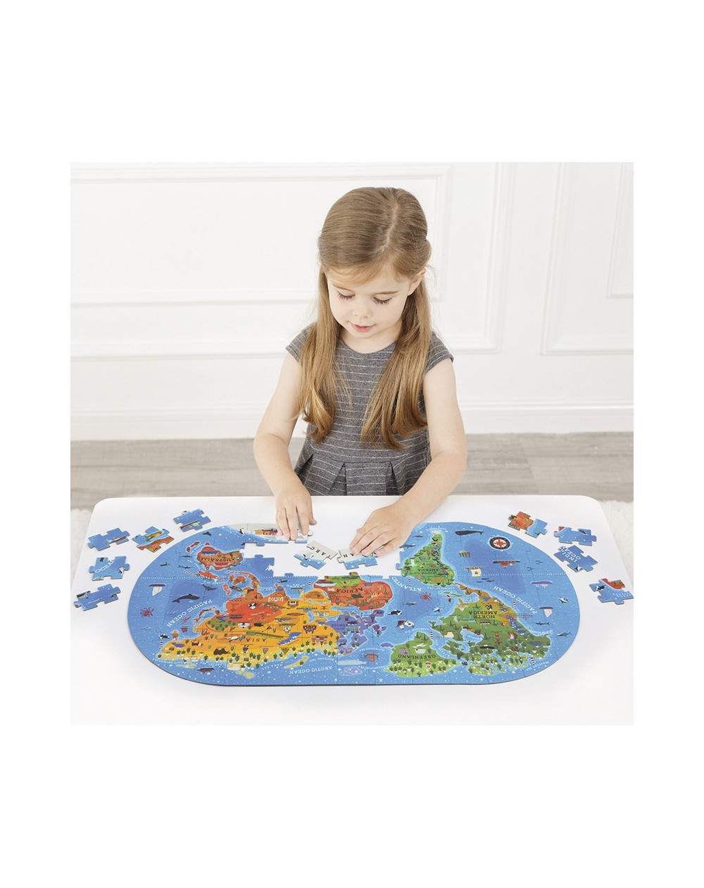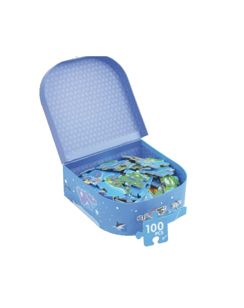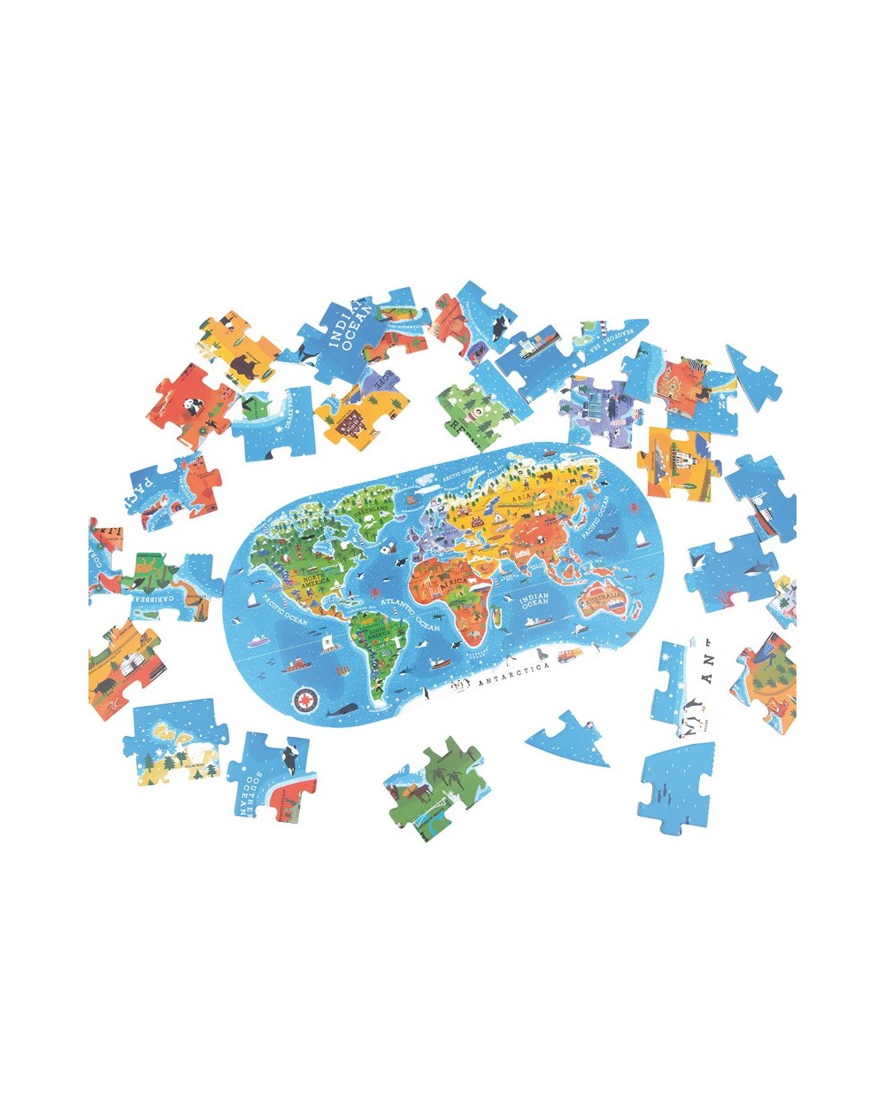 Puzzle mapamundi de 100 piezas. Tamaño del puzzle montado 87cm x 46cm. Incluye una guía.
