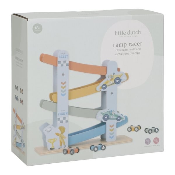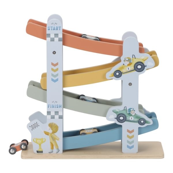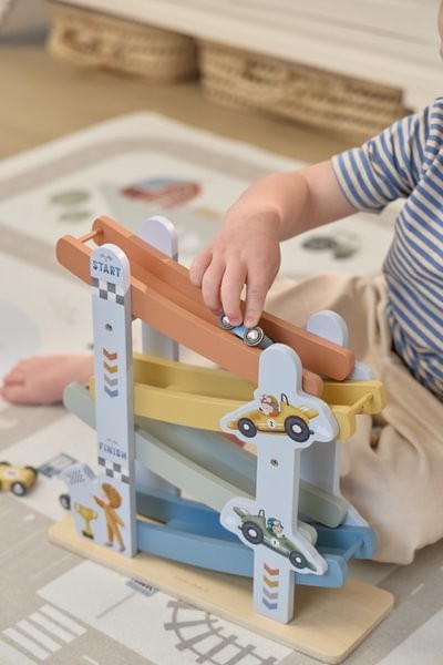 ¡Preparados, listos… ya! Esta alegre pista de carreras de madera está repleta de diversión y viene con 4 coches de colores. Con su genial temática de carreras y divertidas ilustraciones, es perfecta para los pequeños aficionados a las carreras. Coloca los coches uno a uno en la parte superior de la pista, suéltalos y observa cómo bajan a toda velocidad. ¡Un momento lleno de acción que garantiza diversión sin fin!