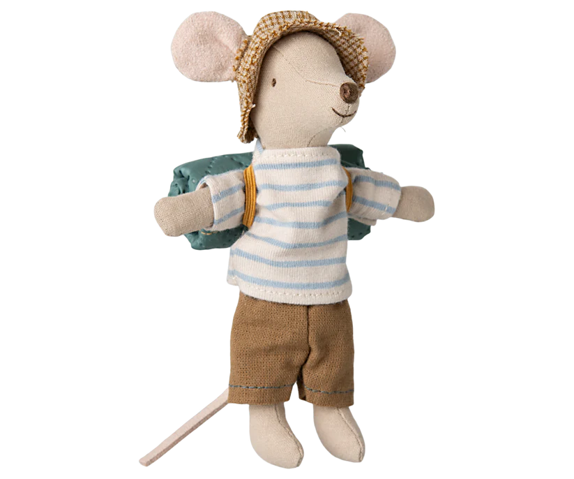 Este ratón está bien equipado para una excursión por la naturaleza salvaje. Tiene imanes en las manos, va vestido para días de caminata y lleva su saco de dormir para las noches bajo las estrellas.