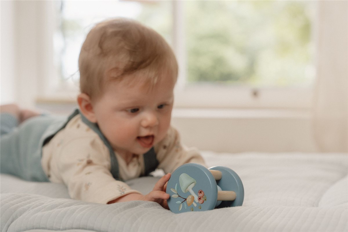 ¡Sonríe, rueda y agítalo con alegría! Este adorable sonajero de madera rueda y rueda, haciendo un sonido de traqueteo a medida que avanza. Sus lados azules muestran una ilustración de la colección Forest Friends, que presenta un par de setas mágicos ubicados en el corazón de un bosque encantado. Diseñado para promover la coordinación mano-ojo, este sonajero tiene el tamaño.