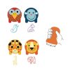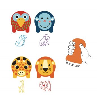 Contenido: 4 sellos automáticos: jirafa = amarillo, león = naranja, mono = azul y loro = rojo.