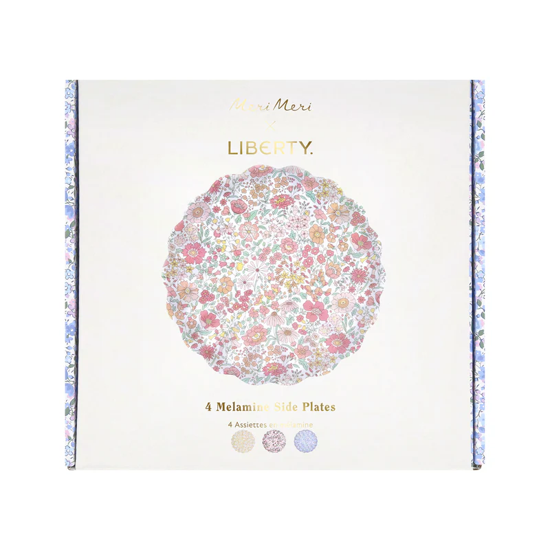 ¡Un set de platos, cientos de momentos especiales! En colaboración con Liberty London, presentamos este elegante set de 4 platos pequeños de melamina, cada uno con un diseño único de Liberty en tonos suaves que aportan sofisticación a cualquier fiesta o comida especial.