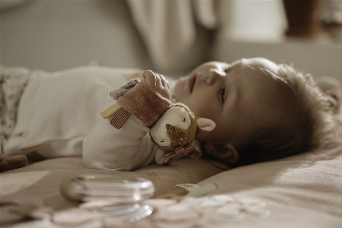 Esta suave pulsera con sonajero entusiasmará a tu bebé.