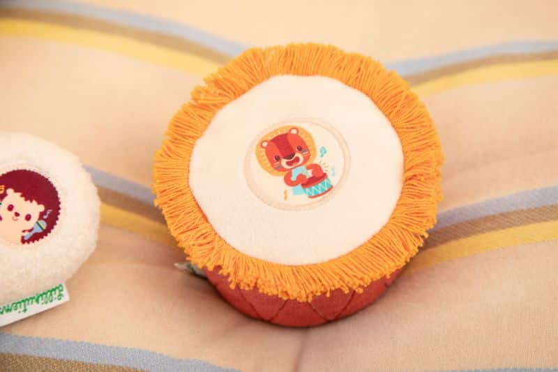 ¡Tocar música es genial, sobre todo con un tambor que hace sonidos bonitos: papel crujiente y sonajero! Jugar, reír, atrapar. Este tambor de Jack el león estimula el oído y el tacto. Al presionar, suena el sonajero. El bebé también aprende a agarrar su suave instrumento musical.