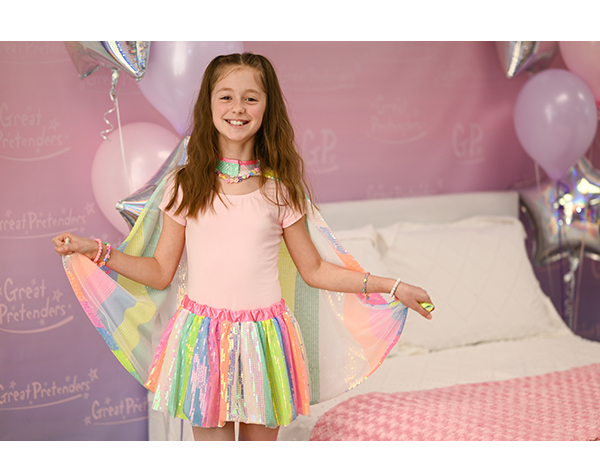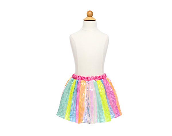Tutú lleno de rayas vibrantes de lentejuelas arcoíris que captan la luz al moverse. Alegre y festivo, ideal para juegos de disfraz y eventos divertidos.