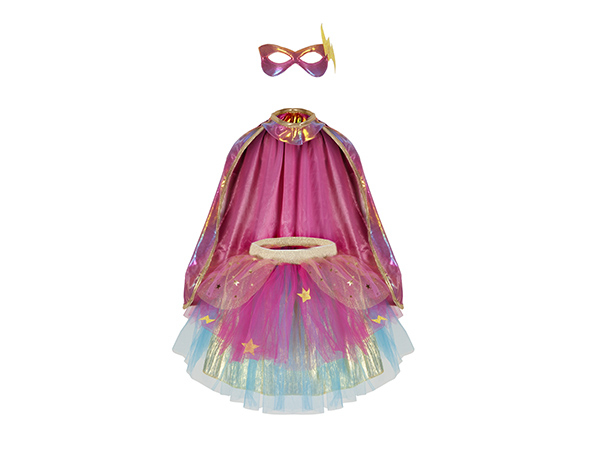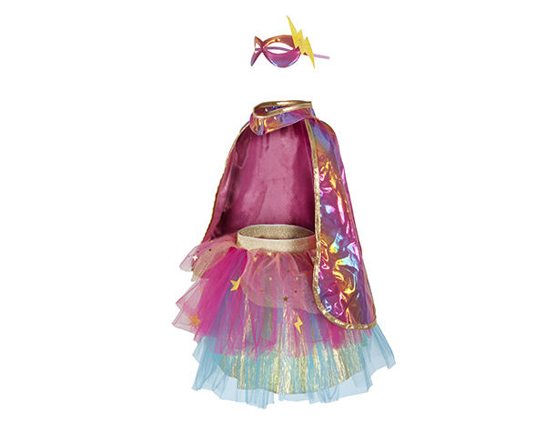 Tutú rosa y dorado con capa y máscara, ideal para superhéroes pequeños con estilo. Materiales suaves que garantizan comodidad.
