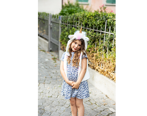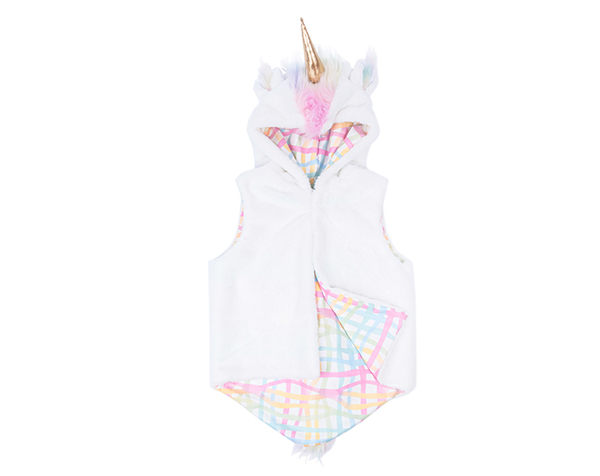 Chaleco de felpa blanca con cuerno de unicornio dorado y detalles en tonos pastel. Forro de cuadros pastel para un toque mágico y cómodo.