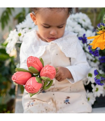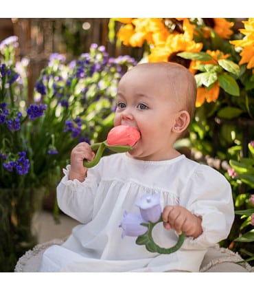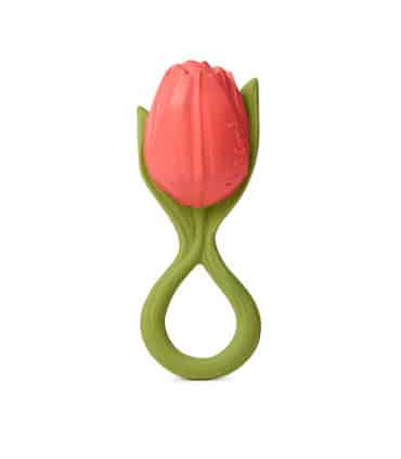 Theo the Tulip es un mordedor, juguete de baño y juego sensorial para bebés. Su forma como un anillo hace que las manitas de los bebés puedan sostenerlo fácilmente mientras utilizan un mordedor natural y seguro. Su amplia variedad de texturas también estimulará los sentidos del bebé y calmará las encías durante la dentición.