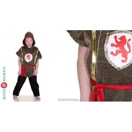 Una auténtica túnica de caballero, con cota de malla dorada, escudo de armas, cinturón rojo… ¡y capucha medieval!