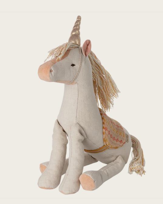 Una historia mágica está a punto de comenzar. Con este unicornio realizado en tonos coloridos y un cuerno dorado, hay muchas historias que contar. Viene con una silla de montar para un cómodo paseo.
