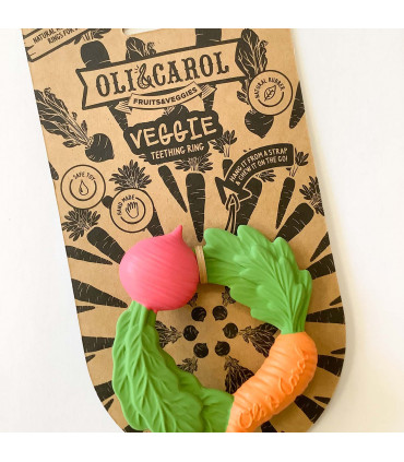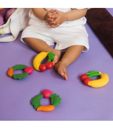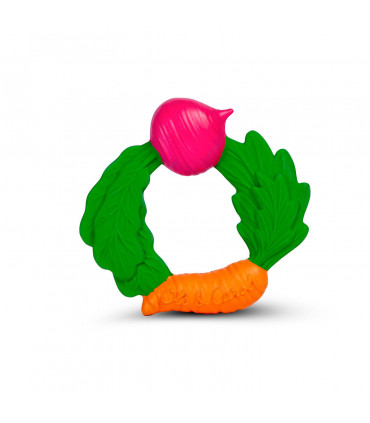 ¡Este mordedor veggie es el anillo de dentición más saludable para recién nacidos! Fabricado con caucho 100% natural y pintado a mano con pigmentos naturales. Perfecto como mordedor, juguete de baño y juguete sensorial. ¡Sus colores vivos, texturas detalladas y forma ergonómica estimularán los sentidos de los bebés mientras calman las encías durante la dentición! Suave y flexible para agarrar fácilmente con las manos del bebé y también para colgar.