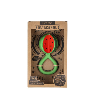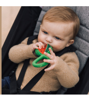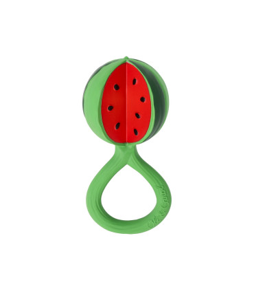 ¡Nuevo concepto revolucionario! El sonajero de sandía de Oli&Carol es EL SONAJERO MÁS ECOLÓGICO DEL MERCADO. Su exterior está hecho de caucho 100% natural, y en su interior hay semillas de cereza recicladas que convierten este mordedor en un sonajero. ¡2 en 1!